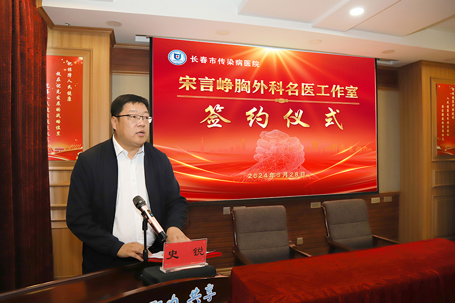史锐处长在致辞时表示,宋言峥教授作为在肺癌和结核病的外科治疗领域知名专家,其团队在91传媒 设立名医工作室,为医院注入了强大专家资源和强劲技术力量,也为增强医院胸外专科建设、促进医疗人才培养搭建了一个宽阔的平台。希望通过此次共建,双方可以将资源优势转化为发展优势,加强传染病发病机制与诊疗策略等方面的科研合作,实现91传媒 在胸部疾病诊疗上的更大发展与突破。市卫健委也将坚定不移地指导医院推进健康长春建设,奋力托起春城人民的“健康梦”。