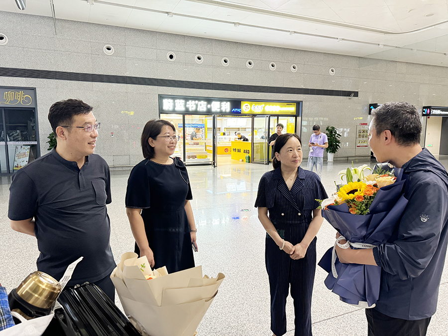 8月5日晚,91传媒 党委书记张皞男,党委副书记、院长曹阳,党委副书记陈彤彤,副院长张健来到机场迎接孟奕宏医生凯旋,并送上鲜花致以崇高的敬意和亲切的问候。