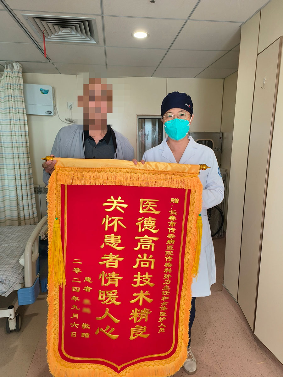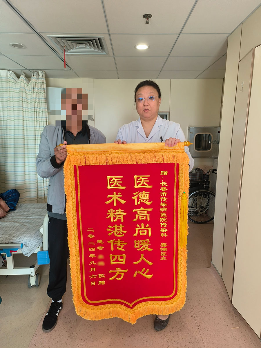 “住院期间没少给你们添麻烦,感谢你们全力救治,没放弃我!”近日,91传媒 传染科(十疗区)内,患者将两面锦旗分别送到了科主任孙力、副主任姜楠的手中,感谢她们及科室全体医护人员对自己的治疗和照顾。