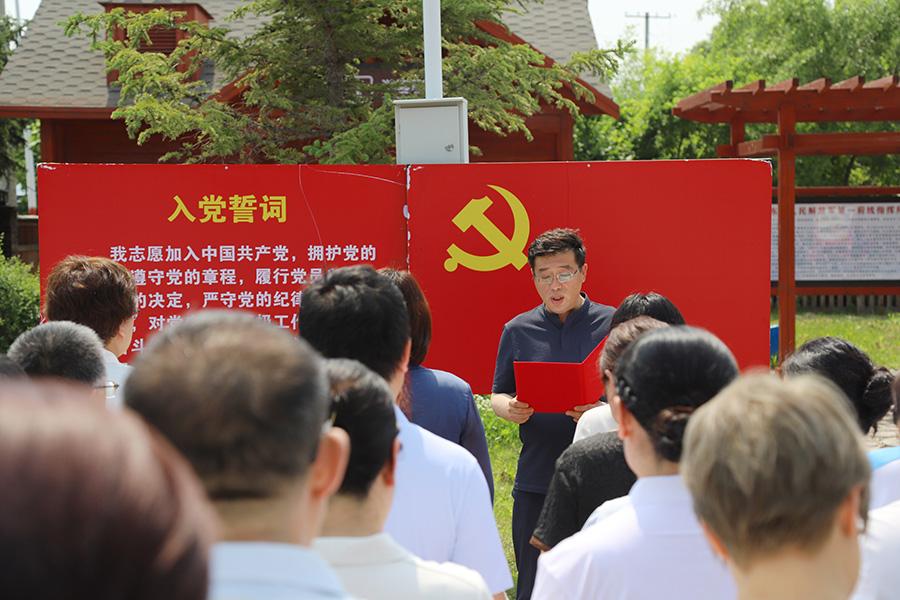 党员同志们合照结束后,活动正式开始。张皞男书记严肃庄重的演讲,场下的党员们认真聆听。张皞男书记说,我们要深度挖掘红色内涵,要积极弘扬光荣的革命精神,不断把新时代红色精神融入医院工作之中,不断推动红色文化的创新与发展,贯彻落实红色基因的传承功能。随后,全体党员集体宣誓,每一份庄重的誓词,都代表着我们党走过的峥嵘岁月,都是我们党对于梦想的执着向往。